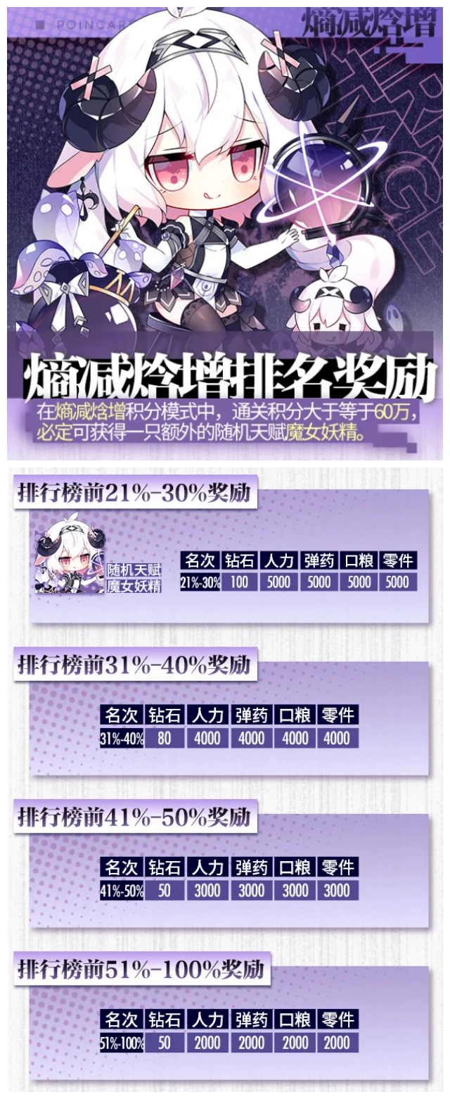 8月26日维护后至9月23日10:00活动期间,指挥官排名积分大于等于60万时将会在活动后必定获得一只“魔女妖精(随机天赋)”,同时,关卡最高分还会计入活动期间出现的排行榜