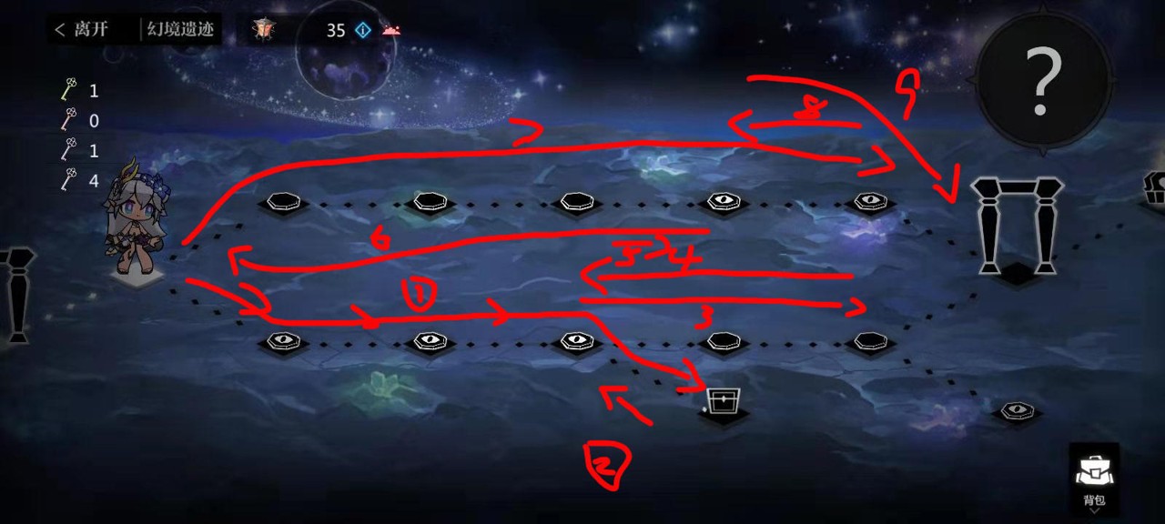 带地板的树林地形,可以利用碰撞歪树直接返回起点的规则进行,从右边返回之后把出门第一个地板卡成黑色跟着直树走就行,奇遇不一定在中间,也可能在上面一点,基本玩法不变。不建议使用道具(难度系数偏低且步数偏少)