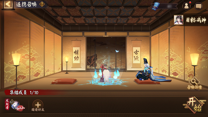 大人可选择一名SSR/SP式神为目标式神,创建召唤屋并邀请好友进行连携召唤(召唤屋最多可加入9名好友。)。