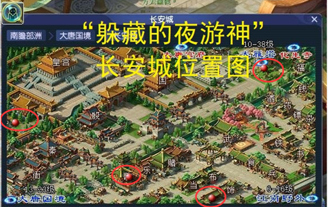 四个躲藏的夜游神的位置分别在大雁塔、地图左边、地图中间下方以及地图的右下方。