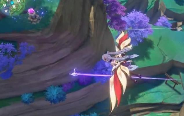 2、借助风场起飞,可以看到紫色的雷元素在进行位移,等它第三段移动到下图位置的时候降落触碰互动,然后快速落回到小岛上。