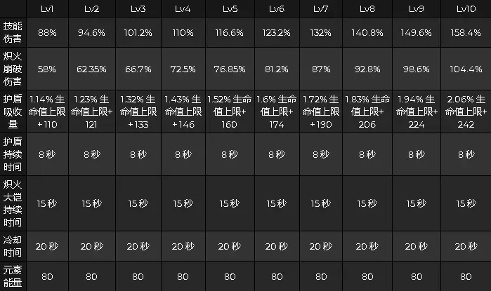 E技能:向前方造成伤害,并且召唤一个持续8秒的火属性护盾。