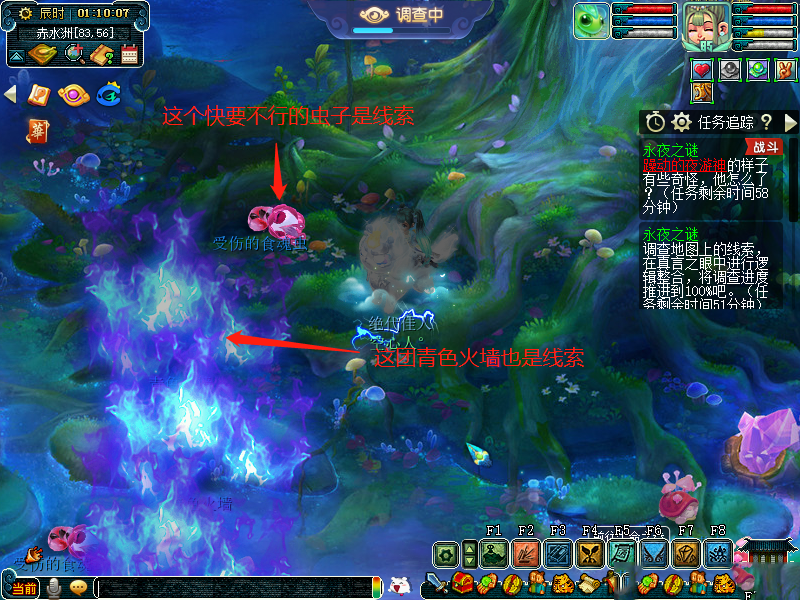 开始寻找线索 坐标82.57有一只快要不行了的虫子还有一堵青色的火墙都是线索