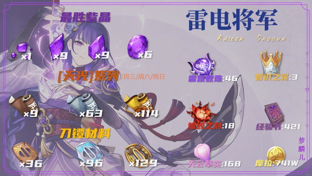 街机cn 来源:厂商 发表于:2021-09-03原神2.1版本中上线了新的角色,雷电将军想必不少玩家们都已经抽取到了吧,那么抽到了的第二步当然就是要培养了,话不多说今天小编就为大家带来了雷电将军的全部培养材料的获取攻略。感兴趣的玩家们快来看看吧。(攻略内容来源于米游社作者梦麟儿)