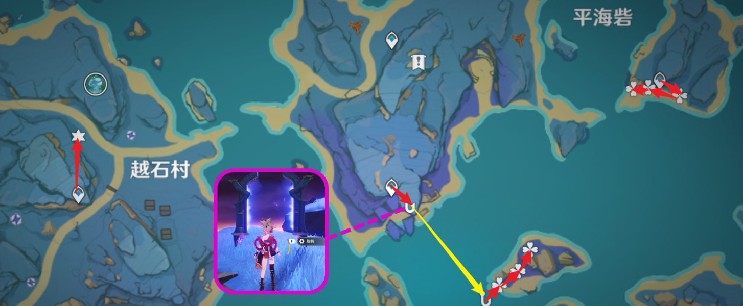 图中黄色线路为利用传送门飞行,需要注意的是,飞行终点并非黄色线路终点,需要在途中注意角色位置及时降落。