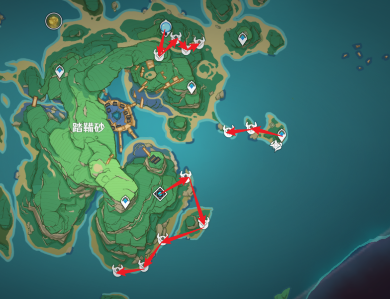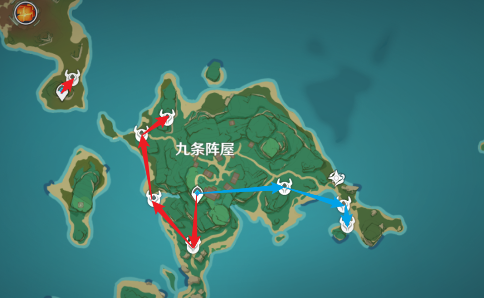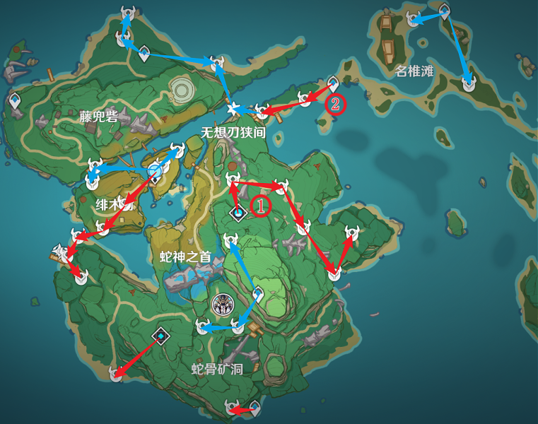 红色线路为高效线路,适合日常刷取。蓝色线路适合急需补充.其中1号线路第三点位、2号线路第二点位均需走到对应位置触发。