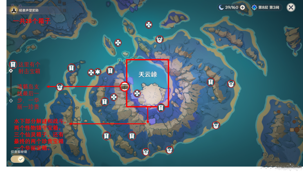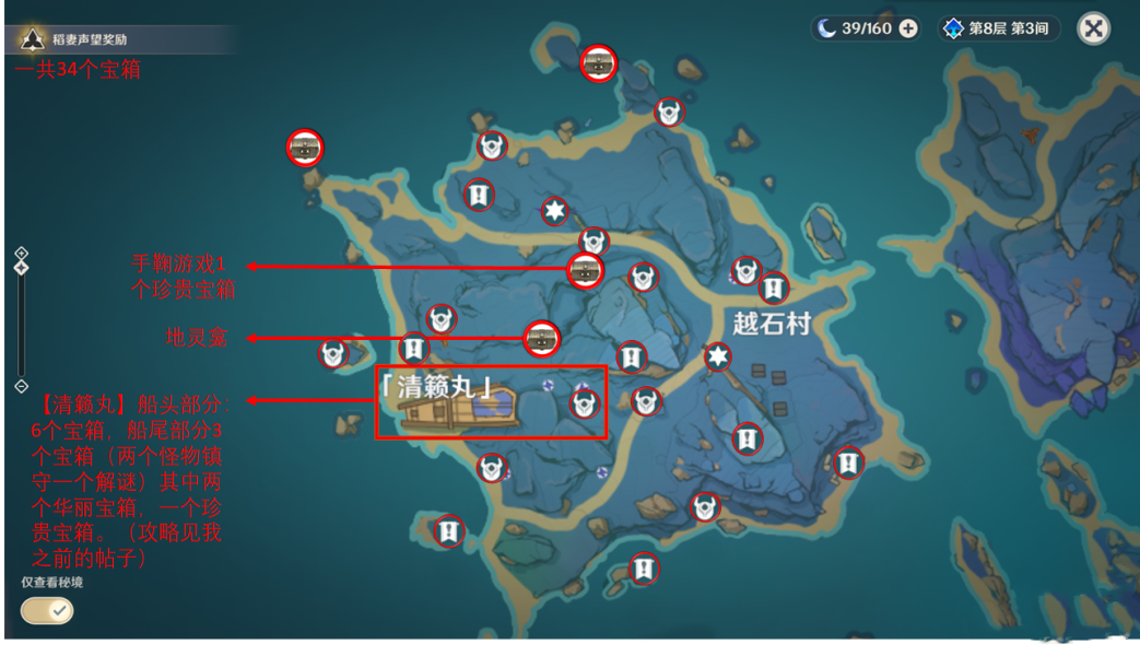 这一篇攻略的主要作用还是用来给大家查漏补缺的,清籁岛一共是94个宝箱,位置也都在图中标明了,地形比较复杂的区域在这里只介绍了宝箱数目。