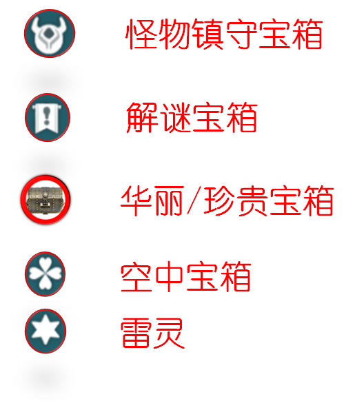 任务图标是【解谜宝箱/雷灵】,怪物符号是【镇守类宝箱】,六角星是【雷灵】。图示如下。