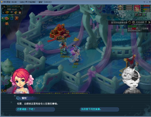 接下来是第三天,说实话我做的时候一脸懵逼,开始依旧看动画片,然后传送到月宫看到兔子在偷礼物,然后跟兔子打一架,不过这个不用出手,夜游神会一巴掌拍死主怪,小怪直接逃跑