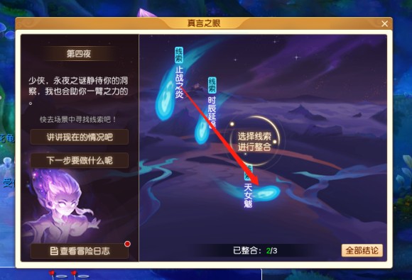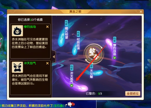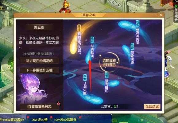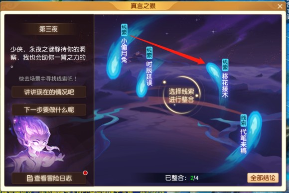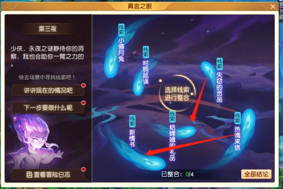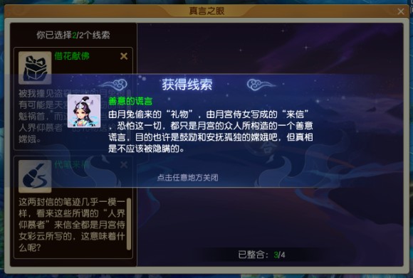 这里相关线索四个,建议首先点击一号位,是一封情书,然后二号位天官名录,接着会提示合成线索,把情书和名录都点上选择整合,第一条就出来了,然后点击三号位遗失的发钗,提示是月宫出产,紧接着到月宫门口发现有个拦路的天兵,对话