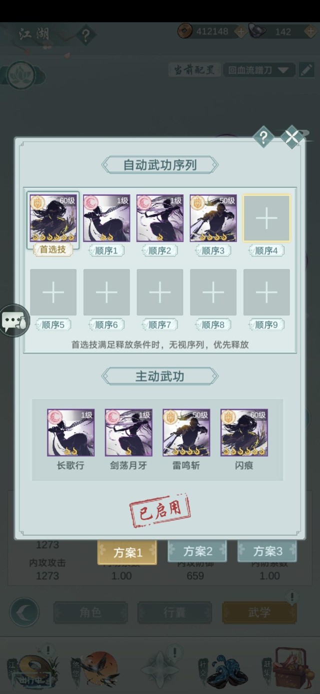 对于2号位技能,尽量用cd短剑意消耗低或者能回剑意的技能组成连招。CD要求基础cd小于等于1s,即4息,剑意越低越好。这个2剑意技能可以是剑荡月牙、斩云剑法、望月剑法等等。