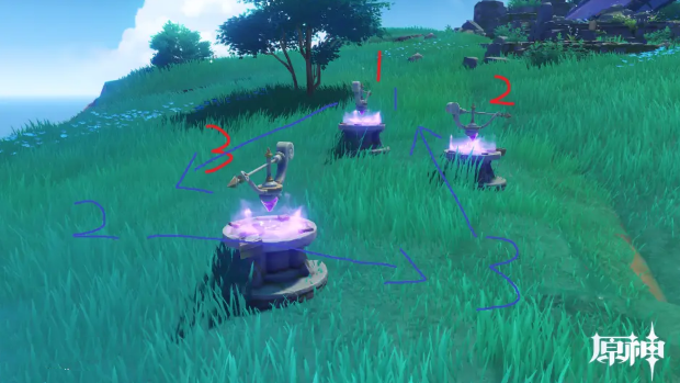 因此我们需要在初始雷灵抵达3号探针左侧(蓝色笔迹2号位置)时放出第二只雷灵,并控制角色站在第二只雷灵前沾染雷元素(即站在3号探针的正确位置)