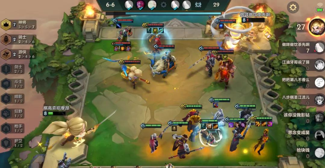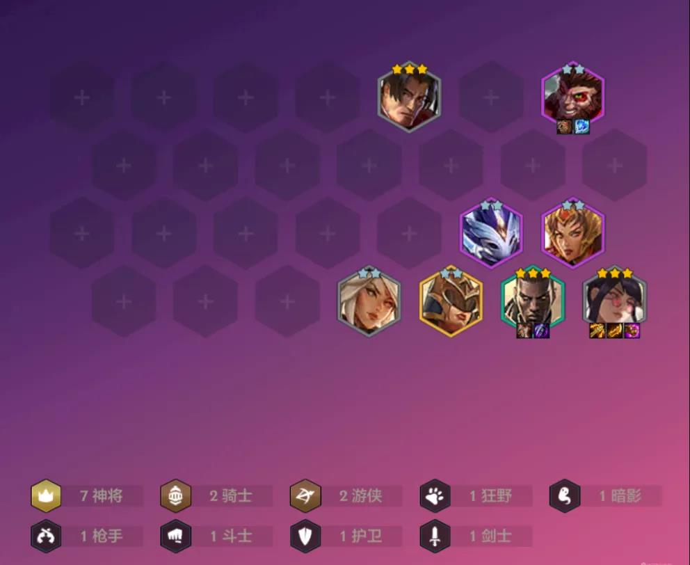 5阶段后:升级8人口找到圣光战神(天使),阵容成型,7神将2骑士2游侠。现在大部分阵容都打不动咱们,坦度与续航极高,站位躲避好刺客特别是帝国之手(卡特),就能无脑连胜。
