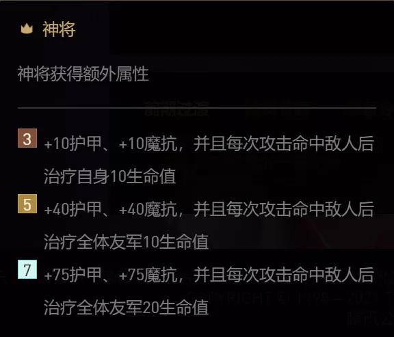 另一方面7神将羁绊下神将棋子每次普攻命中都会为全体友军治疗20生命值。而神将中高攻速棋子较多,阵容续航能力极强。
