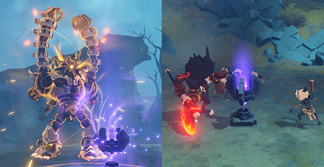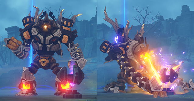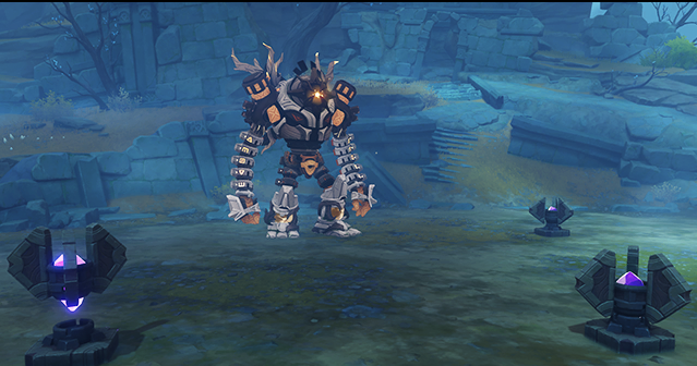 4、机体承受过载伤害或者到达一定活动时间后,「遗迹重机特异体」将进入充能状态,从「普尔希娜光钉」中吸收雷元素能量以强化自身。完成强化后,特异体将会更改反击目标,对旅行者发起攻击,特异体的攻击可能会惊扰附近的敌人。而敌人靠近时将受到「普尔希娜光钉」的吸引并向其发起攻击。