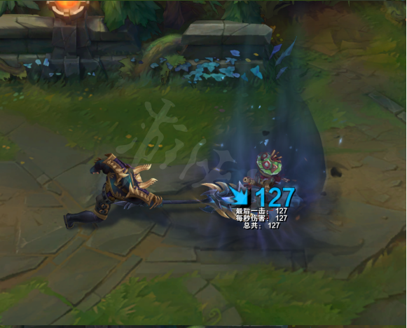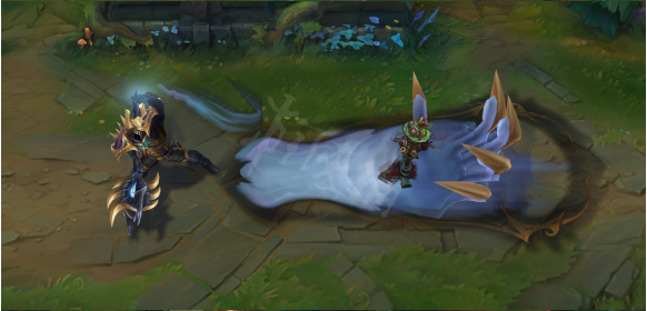 Q技能的整个特效十分精致,准备猛砸地面时,地上会由远到近亮起一个金属风格的人物图案(新五杀琴女的回城和R技能也会出现这个图案),攻击过后地上还会残留图案痕迹。