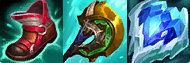 狗头的鞋子可以根据实际情况来选择。如果早起想更好的叠Q的话,可以考虑出CD鞋,这样CD能更快的转过来。神话装备考虑做出神圣分离者,这样可以配合“咒刃”的效果更好的配合狗头的Q打输出。第三件装备可以出冰心,增加狗头的坦度、对抗能力。