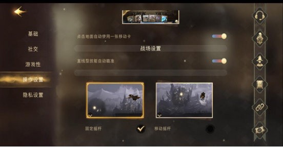 在游戏性设置中,遥感操控设置、与PC端相同的移动卡设置等都归纳在了操作设置中,其中遥感操控方式有固定遥感和移动遥感两种供大家选择。