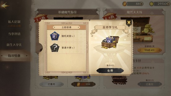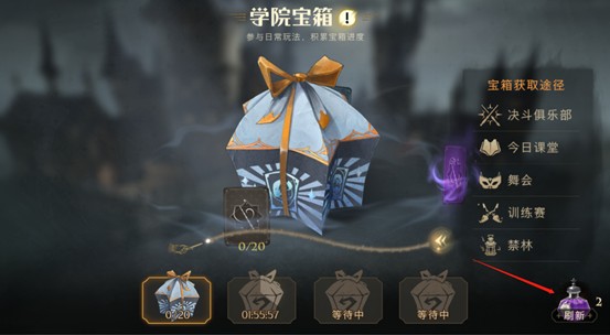 学院宝箱会随机刷新出不同的品质的宝箱,里面的奖励也会有所不同;通过参与决斗、课堂、禁林、舞会等玩法获得宝箱进度,进度满了之后就可以开启宝箱获得奖励卡牌。