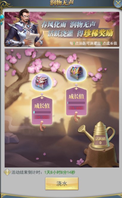 活动期间,玩家累积的日常活跃会被存储进水壶中,消耗水壶中的活跃值可以为桃树浇水,增加其成长值,每1点活跃值可浇灌出1点成长值,成长值达标后玩家可领取对应的奖励。