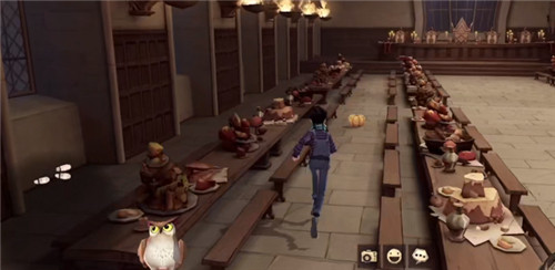 在餐桌之间的过道中行走,会看到地面上有一个南瓜,拾取这个南瓜就能触发“魁地奇”比赛,也就是所谓的保护南瓜玩法,需要带着南瓜躲避中途的干扰抵达终点;