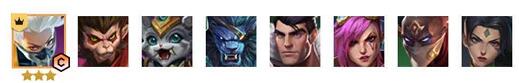 1、阵容搭配:潜行者+齐天大圣+狻猊之心+北境之傲+未来守护者+皮城执法官+海上幽影+西斗之飒