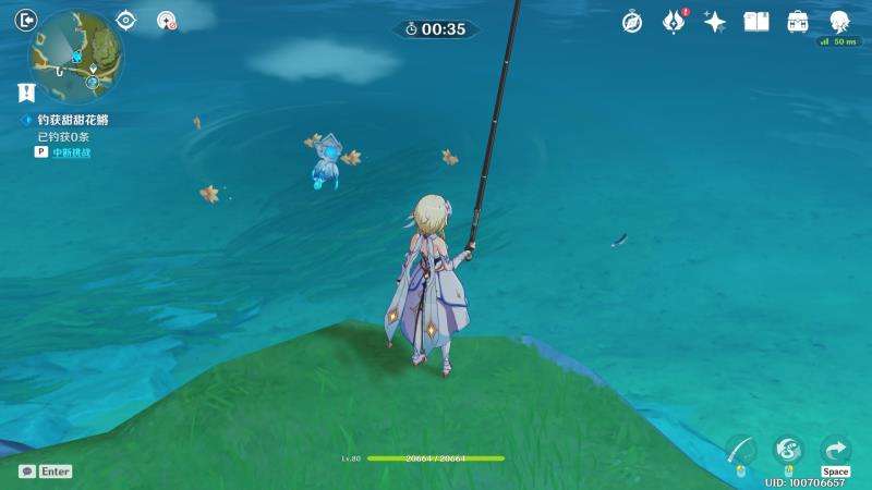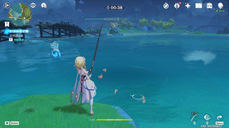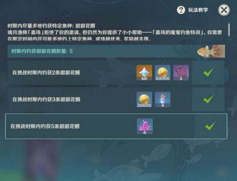 所以,本人秉承着偷懒原则,找到一个逃课开溜小技巧——由于池子一次性只能容纳5条鱼?,而挑战要求是限时钓五条小黄鱼