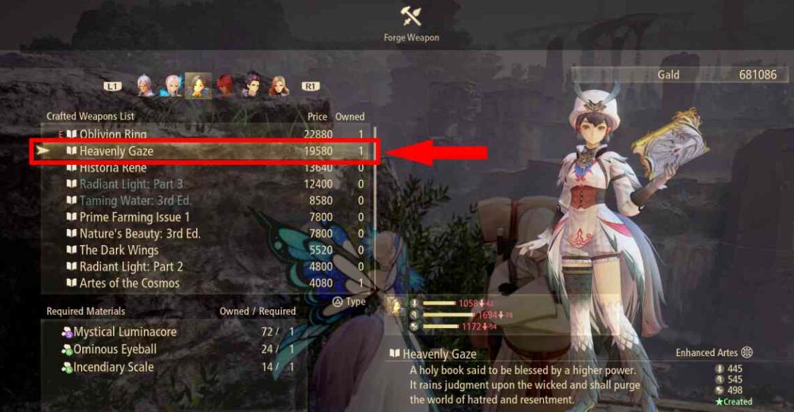 在篝火旁边的商人可以制作武器,直接在他那里制作天堂凝视就可以。