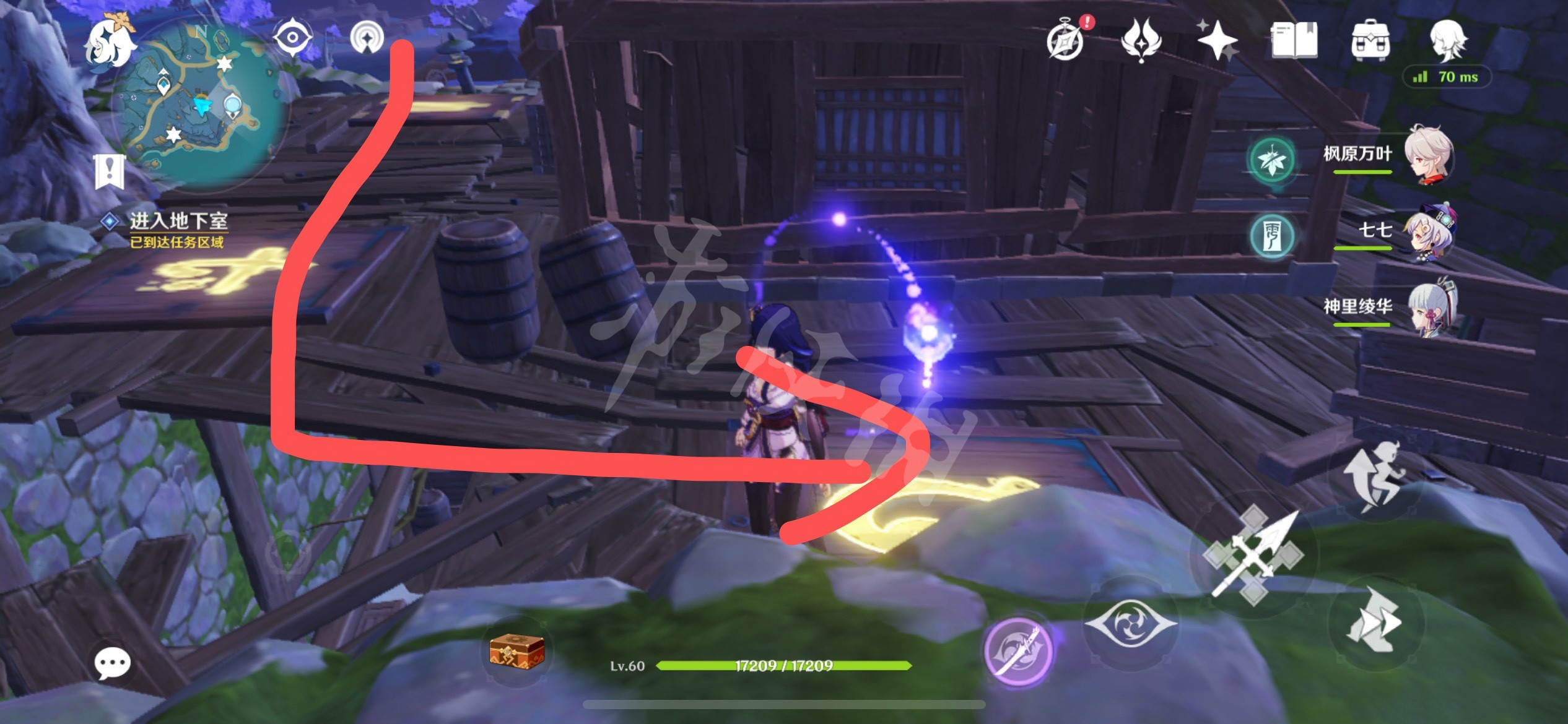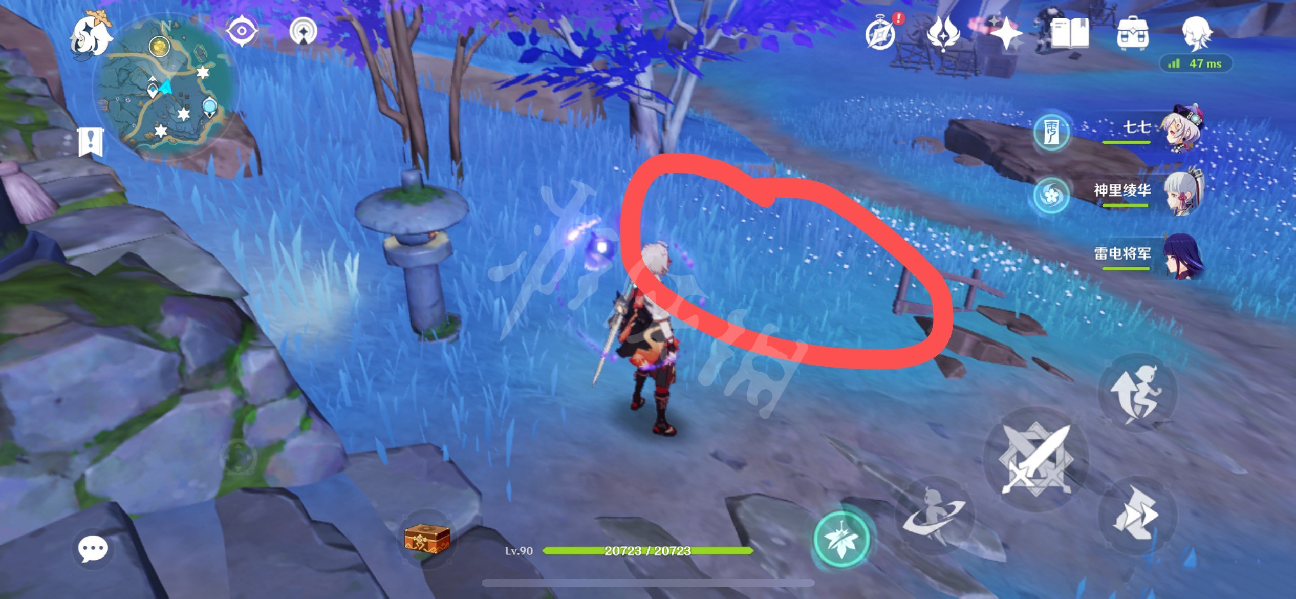 首先,找到如下位置,解救被qq人围住的npc。