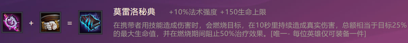 2、麦林炮手出装分析:作为一个远战单位,此英雄一般不给装备,不是主C位,如对面治疗很强,建议给莫雷洛秘典,阻止敌方回血。