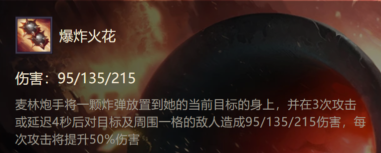 3、技能效果:麦林炮手将一个炸弹放在敌方英雄身上,每次攻击提升50%伤害,炸弹四秒后或者普攻三次爆炸并对周围一格的敌人造成伤害。(如下图所示)