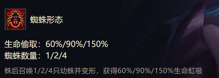 4、技能效果:蛛后释放技能,1星时、2星时、3星时分别偷取敌方生命60%、90%、150%并且召唤蜘蛛1、2、4只。(如下图所示)