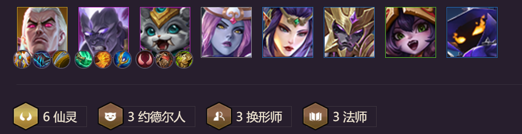 当同时拥有三个换形师、六个换形师的时候羁绊效果分别为:换形师在释放技能变身时额外获取最大生命值60%、100%。(如下图所示)