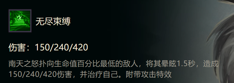 解析:南天之怒会释放技能扑向血量最低的英雄,并且本身得到治疗。