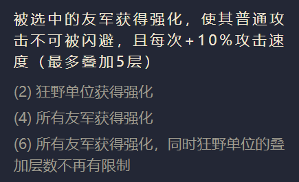 二狂野效果:随机选中的友军,友军开局将会提升攻速,普通攻击敌人无法闪避,最高叠加五层。
