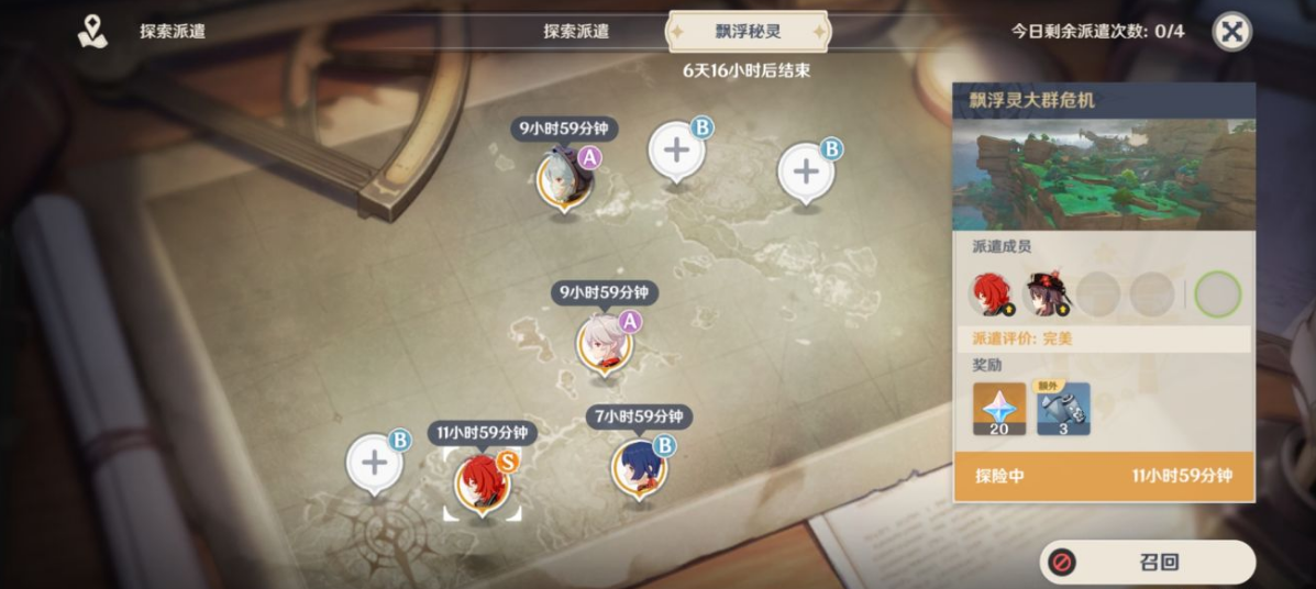 ● 旅行者可召回已派遣角色,召回角色将不会获得任何奖励,同时恢复本次消耗的派遣次数。
