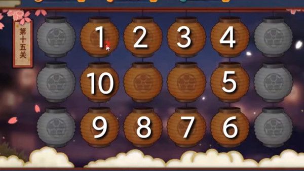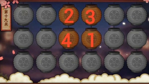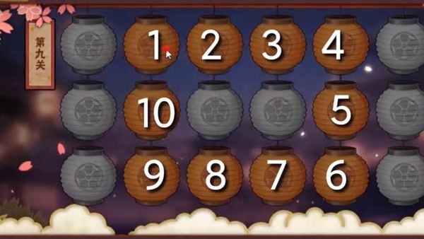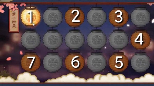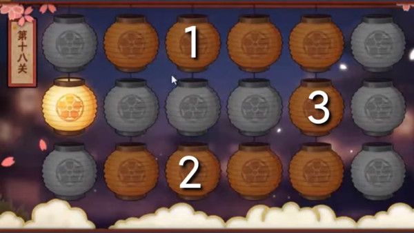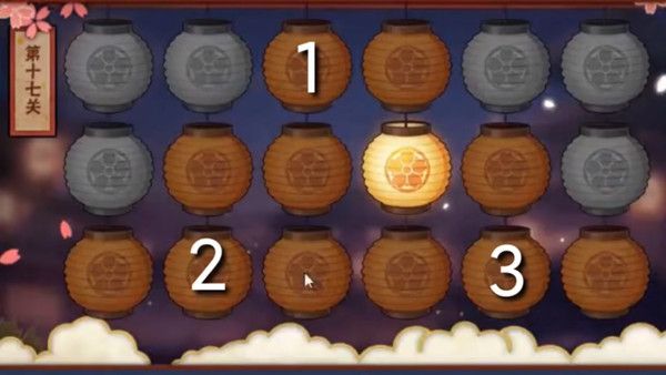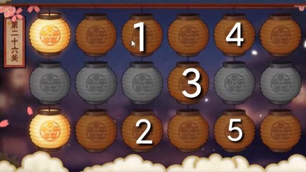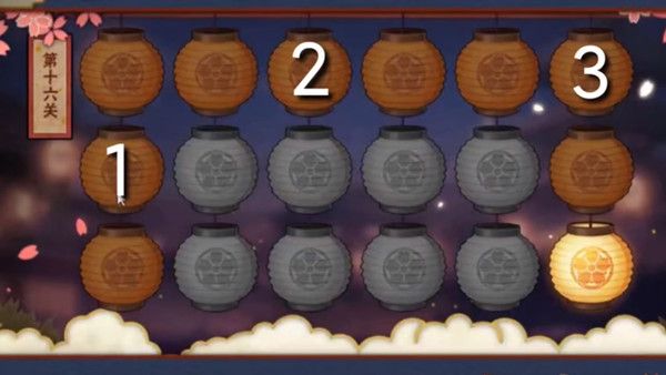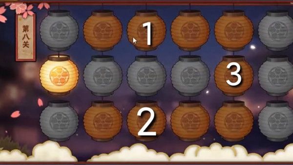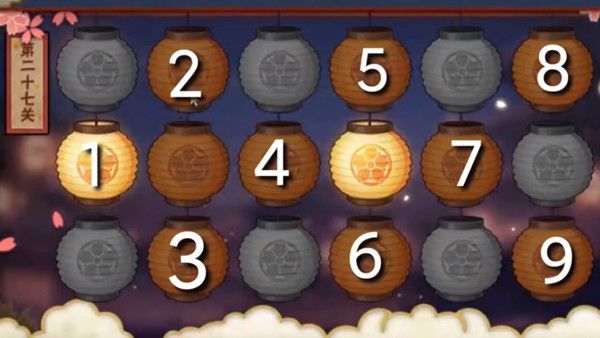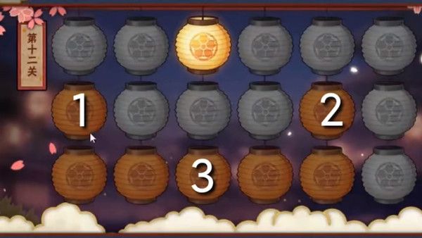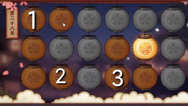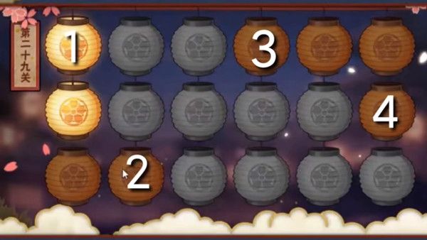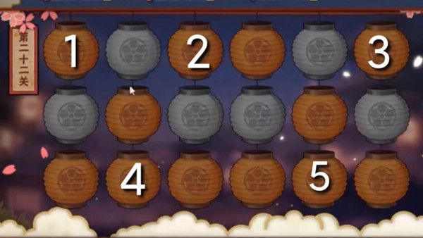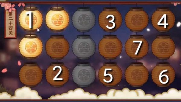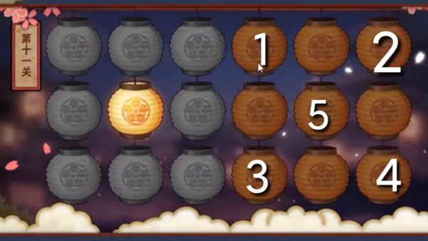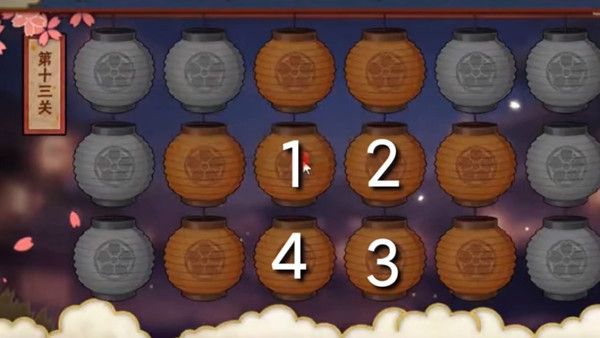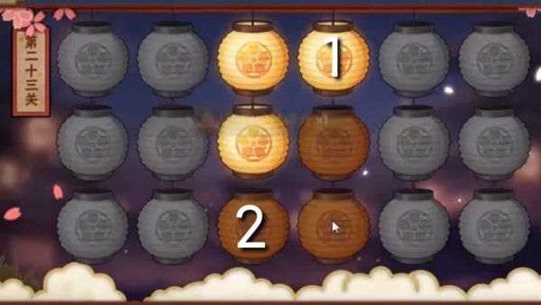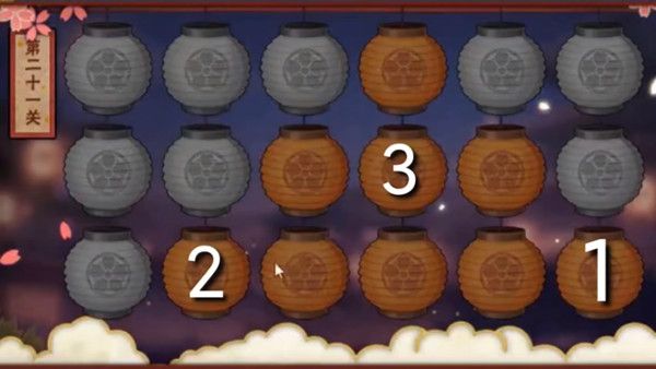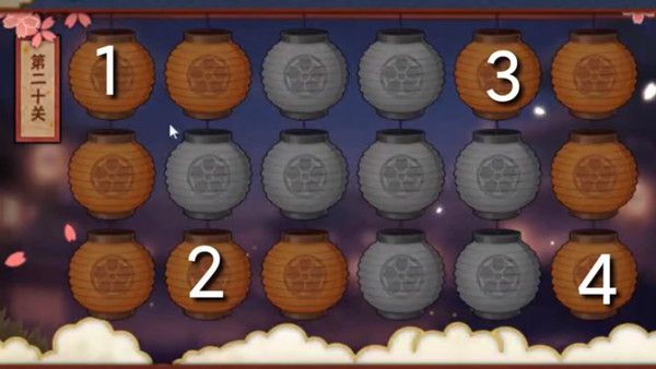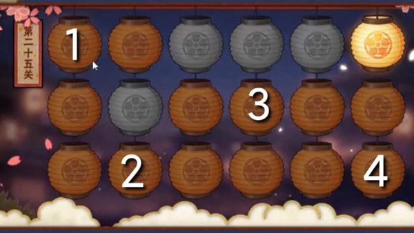 进入关卡后先点击左上角的花灯,然后点击第三排第二个花灯,再在右边依次点击四个角落的位置,最后点亮所有花灯即可成功通关。