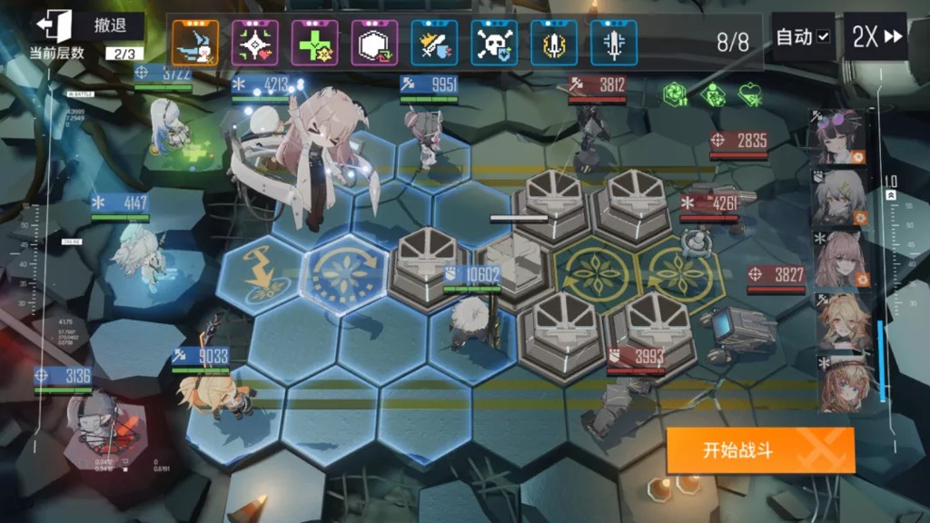 1.首先试试调整人形的初始站位,吃到关卡函数格或改变人形攻击敌人的顺序。一般来说,通过更换站位尽早击败敌方的医师和输出位会更方便通关。