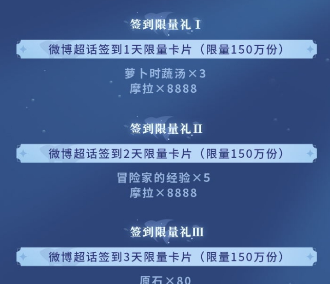 活动期间,在原神超话内连续签到1/2/3天,即可领取并在游戏内兑换对应天数礼包。