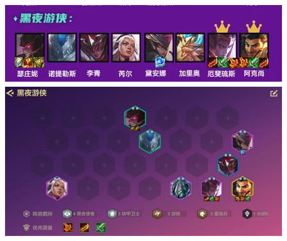 游侠体系还是比较推荐大家玩黑夜游侠,黑夜游侠属于哪种大成后天敌较少强度颇高的阵容,但阵容比较依赖2星厄斐琉斯来的早,否则后期搜不到阿克尚就阵容强度会差别人一截。