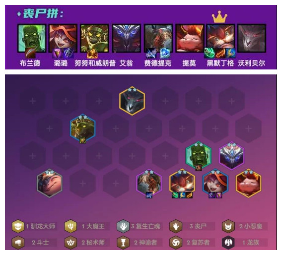 丧尸拼阵容更新后2天玩家人数大幅度增多,黑默丁格的法力值降低到140技能释放频率加快,阵容强度大幅度增强,但阵容比较吃黑默丁格2星,1星不好锁血,二星就有吃鸡的希望。