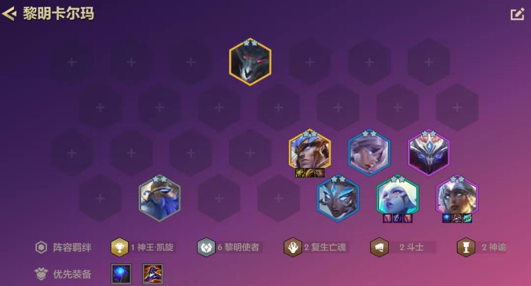 玩卡尔玛比较建议神谕八五,虽说成型强度比较高,但成型后吃鸡强度非常高,测试中几局后期均从黎明卡尔玛转成神谕九五,卡尔玛能启动更快,打节奏差,且阵容控制更稳定。