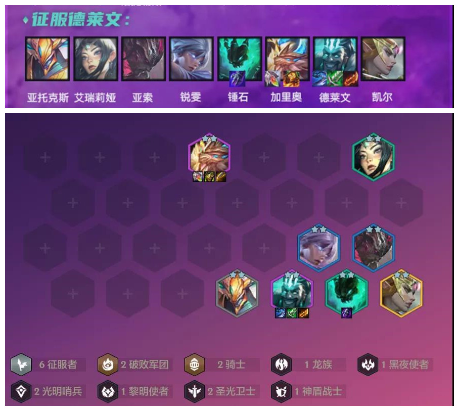 而如果玩6征服还是建议亚索+德莱文/天使/锐雯3则1来C会更稳定一些(6征服亚索C,建议3神盾不要2骑士)。