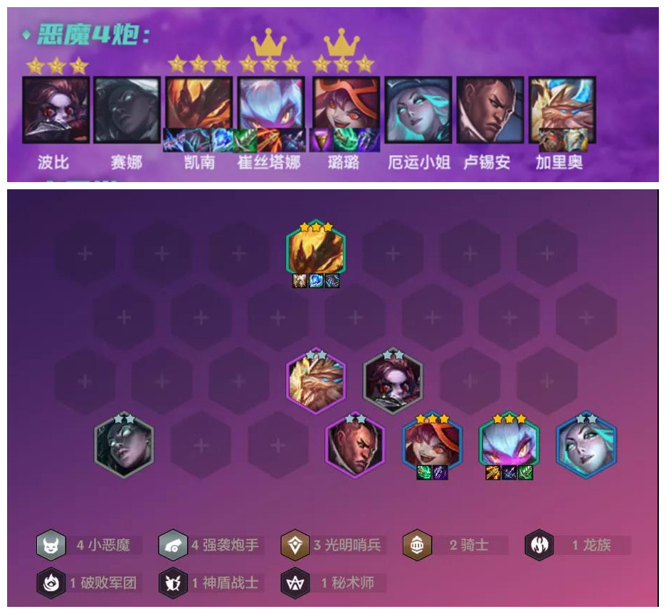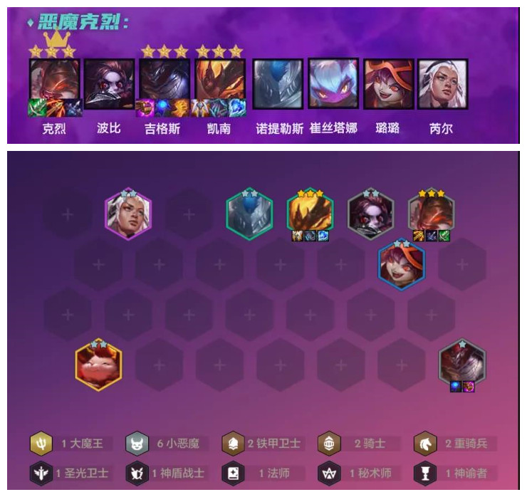 另一套要说的小恶魔赌狗阵容就恶魔克烈,上版本恶魔克烈偷分能力就比较高属于骚套路,但这次更新后3星攻速再次加强输出效率大增,但克烈对装备要求比较高,后期非常依赖有提莫减速,否则只是烂分。