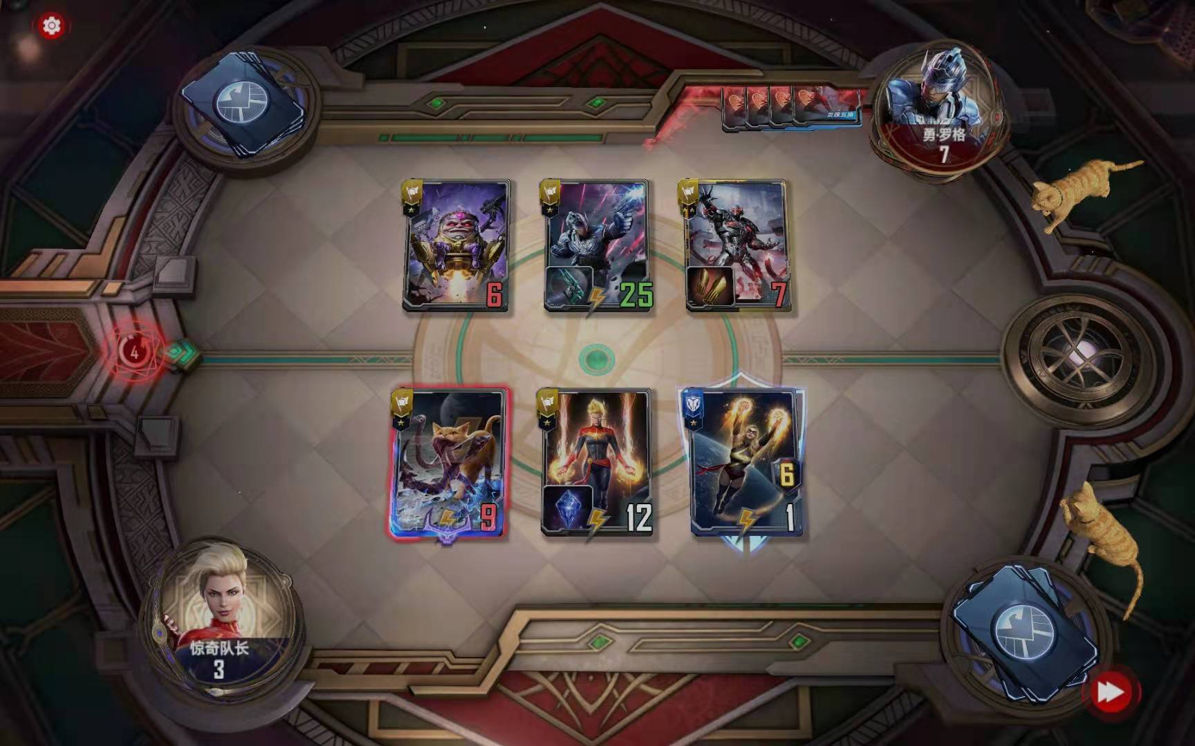 第三小节:购买双星状态和能量操控事件卡都给玛威尔使用,购买勇罗格和猫,并按照下图摆位: