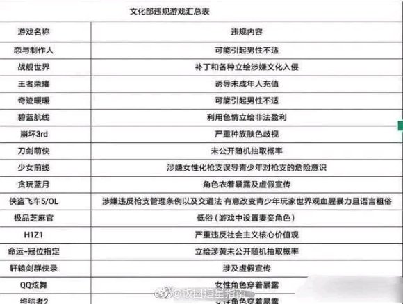 最近传起来的文化部违规游戏表就是图中的这个表,标注了很多游戏的违规电,其实这个图是假的,不是文化部官方发布的,为崩坏3的肤色歧视也是子虚乌有的罪名,请玩家们不要以讹传讹。