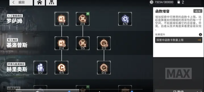 优先级最高的是函数增容,提升探索中函数卡数量,没科技加持的情况下,提升数量上限是100币,满级可以提升四个,对于玩家开荒很有帮助