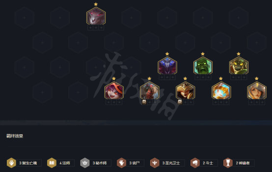 中期过渡体系,我们选择火男、雪人、稻草人、璐璐以及大眼,凑出3丧尸2秘术师以及2法师羁绊,丧尸羁绊的控制以及前排承受,搭配秘术师羁绊的保护,最后搭配主C大眼以及法师羁绊的炸裂输出帮助我们锁定中后期的连胜。这里若多余人口,可以选择凑出其他辅助羁绊,例如2复生亡魂,3秘术师或者2斗都是可行的。