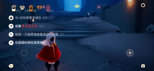 完成方法:进入禁阁地图,一直乘坐电梯或者双人背背来到禁阁顶层;朝着终点神坛左边飞去,可以看到山脚下方有一个冥想点;