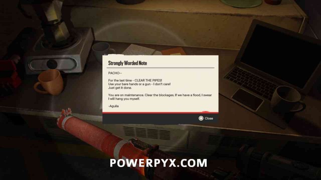 第 2 步:进入后,上楼找到一个开关和一张纸条。该说明解释说,由于管道堵塞,电源无法正常工作。你的任务是通过疏通它们来恢复电力。